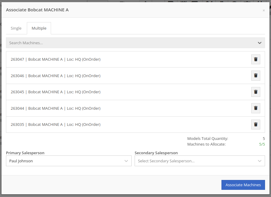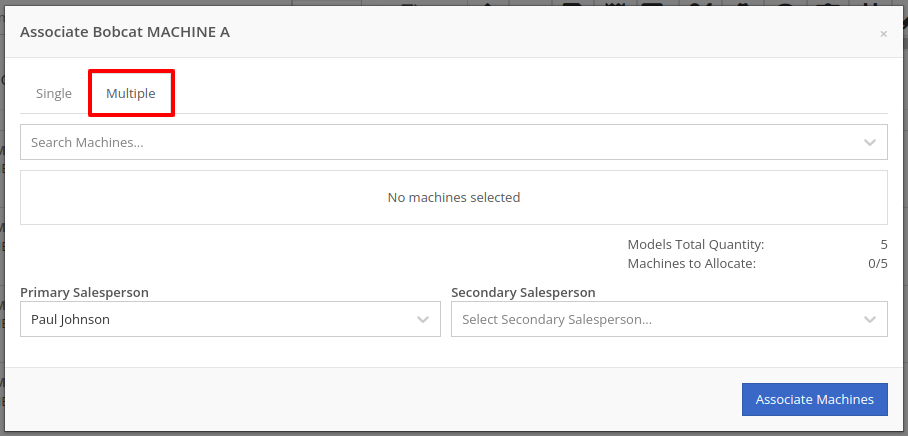 Then, once the Associate window is open, you have the option of either clicking on the “Single” or “Multiple” tab. If you click on the "Multiple" tab, you can then select the Machines that you want to associate to the specific Model. This tab will also include the Models Total Quantity as well as the number of Models that have been associated. You can also set the Salesperson. Click the “Associate Machines” button and all selected Machines will associate.