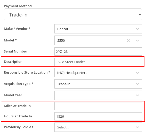 Opportunity: Salespeople have requested the ability edit additional fields when creating a machine from a trade-in, including Description, Hours, and Mileage.Solution: The machine trade-in form has been updated to include the Description, Hours, and Mileage fields. With these, salespeople can input these details directly from the Sales Order. This will save them time as it eliminates the need to navigate to the machine’s dashboard then edit the machine.