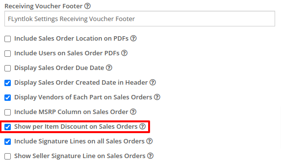 Opportunity: Salespeople have requested that the Sales Order “Thermal Receipt” have the option to display line-level discounts. This option is already available on the full-page-print version of the Sales Order.Solution: The Sales Order “Thermal Receipt” layout has been updated to include line-level discounts (percentage and dollar discount from list). The existing flag “Show per Item Discount on Sales Order” in Flyntlok Settings will now apply to thermal receipts as well.