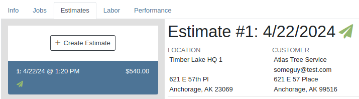 Once a request has been sent via either SMS or email, a green paper plane icon will appear next to the estimate date to indicate that it has been sent to the customer.