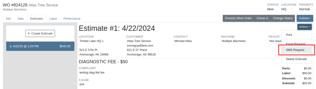 A new “SMS Request” option has been made under the Estimate’s “Actions” button in the Work Order Dashboard. The original “Send Request” button has been re-named “Email Request” to differentiate it from this option.