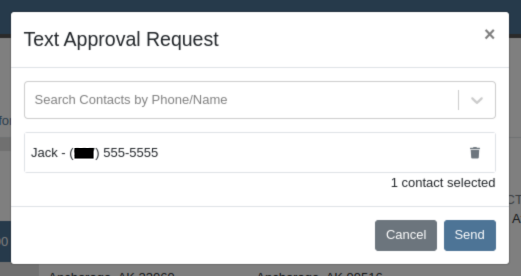 When users select the SMS Request option, they can search for contacts tied to the Work Order’s customer by name or phone number, and select contacts to send the estimate approval link to. Customers will be sent a text message from Flyntlok with a link that leads to the approval page.