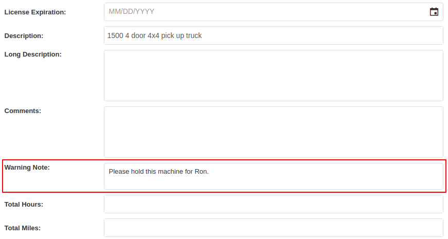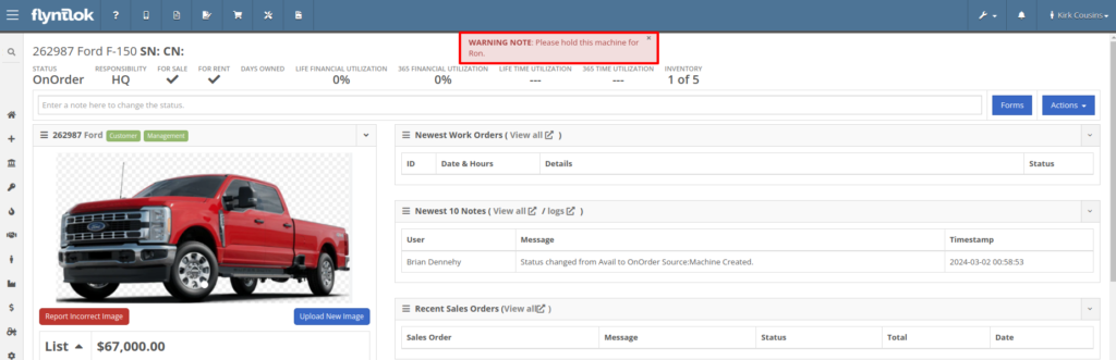 Opportunity: Fleet Managers have requested the ability to track machine hours down to the decimal, providing more accuracy when logging a machine’s utilization.Solution: We have updated machines to support a decimal place when inputting hours. This change brings Machine Hours in line with Machine Miles, with both now able to capture a decimal place.Machine Dashboard Warning NoteOpportunity: Flyntlok users have requested the ability to display a warning on the Machine Dashboard, similar to the warnings on Customer Dashboard.Solution: The Machine Dashboard has been updated to display Warning Notes, which can be added by editing the machine. After adding the warning note, any future visit to that machine’s dashboard will show a popup at the top of the screen presenting the entered note.