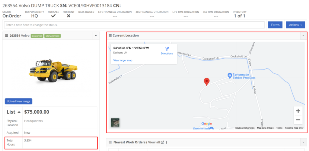 Flyntlok will ingest Volvo’s daily telematics updates for a dealership that is interested in receiving this data. The interface maps the telematics data using a machine’s VIN as a reference. The dealership will need to ensure that all Volvo VIN’s are accurate and up-to-date in Flyntlok.The updated latitude, longitude, and machine hours data will be visible on the machine dashboard as illustrated below.If you are interested in this feature, please work with your friendly Flyntlok Consultant to get this interface setup with Volvo.