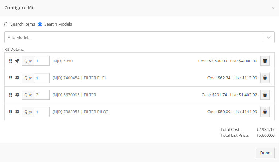 Opportunity: Inventory Managers have requested that Flyntlok display more details on the line items within the kit configuration.Solution: The kit configuration has been updated to display the cost and list for each item, and now has links to the item’s details (whether Items or Models).
