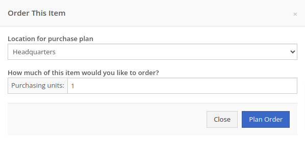 Opportunity: Purchasers have requested the ability to specify a location for their Purchase Plans when creating a purchase from the Item Dashboard.Solution: We have updated the Order Item modal to support a location selection. Purchasers can now choose a location for their Purchase Plan at the time of creation.