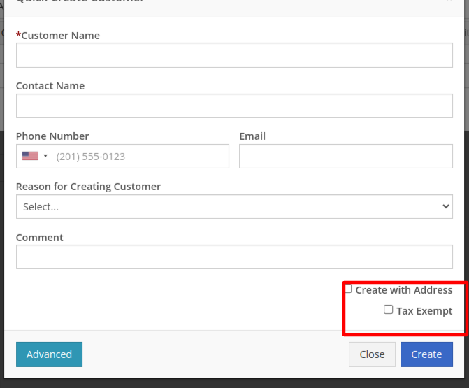 We have added a new "Tax Exempt" option when using the "Quick Create Customer" feature from a Sales Order.