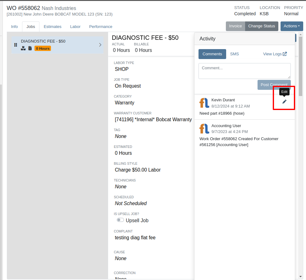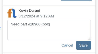Comments in the Activity panels on Work Order and Rental Dashboards are now editable. Any time a user edits a Comment, the edit history is recorded in the associated log. This feature requires elevated permissions. Admins can manage authorized users via the “Edit Notes/Comments” permission, located under the Wrench → Users → Access Control.