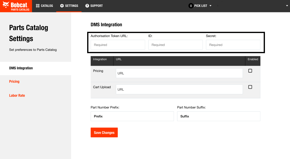 Log in to your Bobcat account and go to Parts Catalog. If your account has access, you should see a "Settings" link at the top navigation bar. Then click on the "DMS Integration" link on the left sidebar.