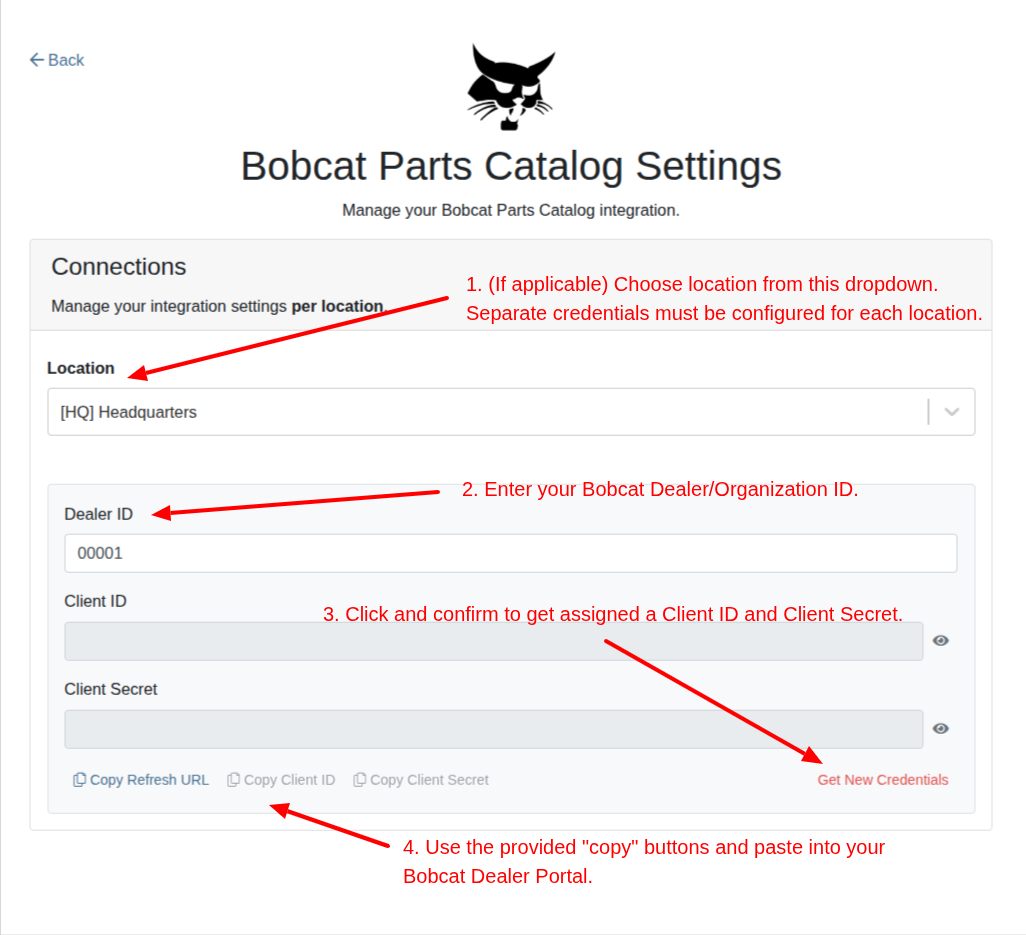 In Flyntlok, access the Bobcat Parts Catalog Settings page. You can access it through the top-right Wrench Icon > Flyntlok > Integrations, then click on "View Bobcat Parts Catalog Settings".Or access this link directly if you are already logged in to Flyntlok: https://flyntlok.com/rc/integrations/bobcat-opc