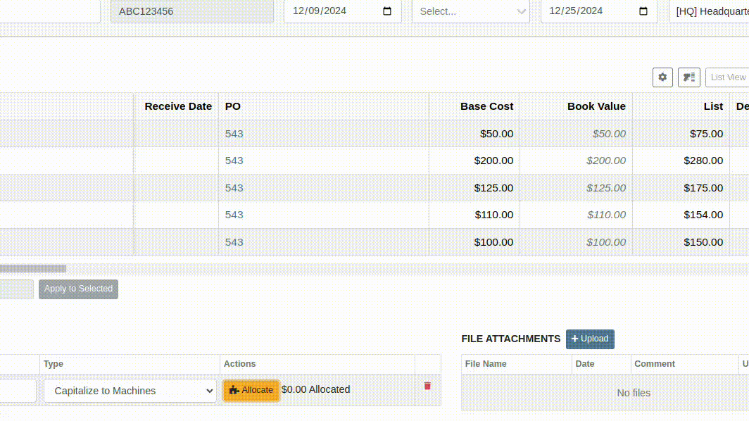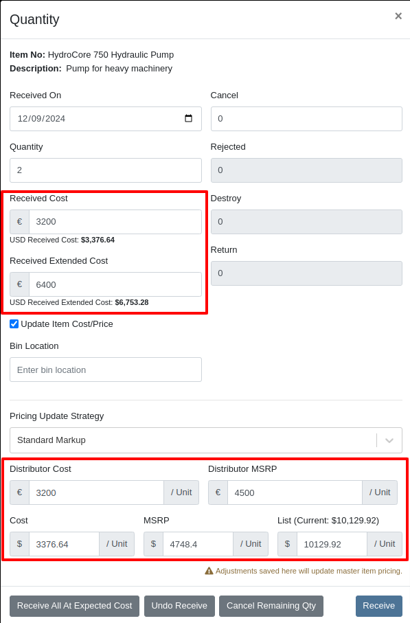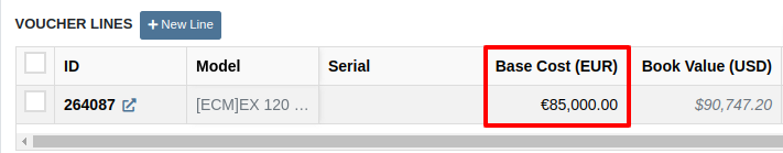 When receiving a line on the Receiving Voucher, you enter the base cost in the Vendor’s currency, and Flyntlok automatically calculates the machine’s book value in your company’s base currency using the FX rate visible above. Fees and credits behave the same way.