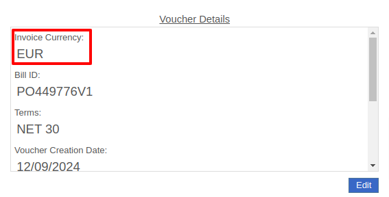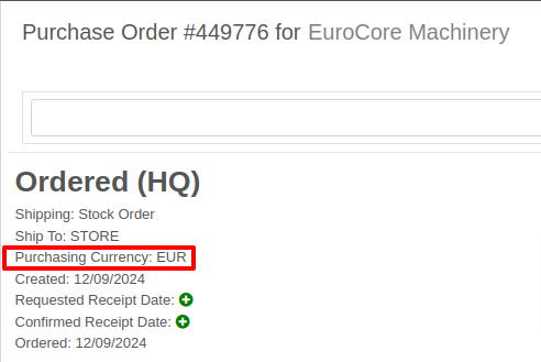 For Part Purchase Orders, the currency that a Vendor sells in, such as Euros or British Pounds, is visible on the Purchase Order on the lefthand side of the page. You can only purchase in the currency set on the Vendor record (i.e. you cannot change the currency on the PO away from the Vendor’s currency).