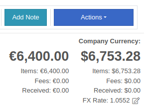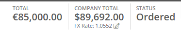 The total for the order is displayed in both the Vendor’s currency and your company’s base currency in the upper right hand corner of the page, along with the FX rate from the Vendor’s currency to your company’s base currency. Flyntlok retrieves the FX rate for all necessary currency pairs on a daily basis, so you will always have the latest rate available to you. Clicking on the pencil next to the FX rate allows you to override the “official” FX rate to one of your choosing.