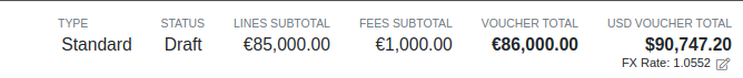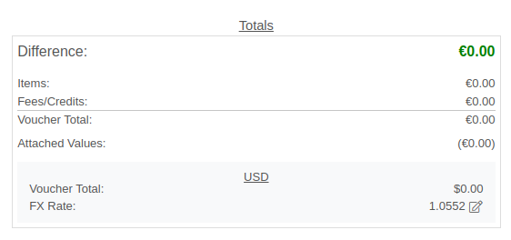 Once you have received part or all of a Purchase Order and have created a Receiving Voucher, you will see that the Vendor’s currency carries over to the Receiving Voucher. As before, the Vendor’s currency is visible on the left and the totals in Vendor and your company’s base currency are on the right. You can also override the FX rate here, just as you can on the Purchase Order.
