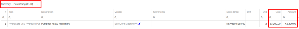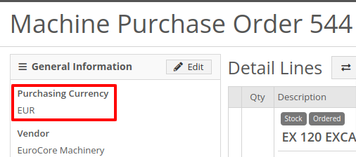 Machine Purchase Orders work much the same way. The Vendor’s currency can be seen on the left side of the screen.