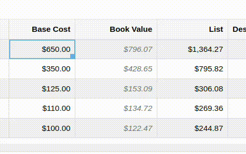 With Auto Calculation enabled, models matching a Pricing Rule will automatically apply its Pricing Matrix during data entry and subsequent cost updates. For example, using the Price Matrix configured from the example above: