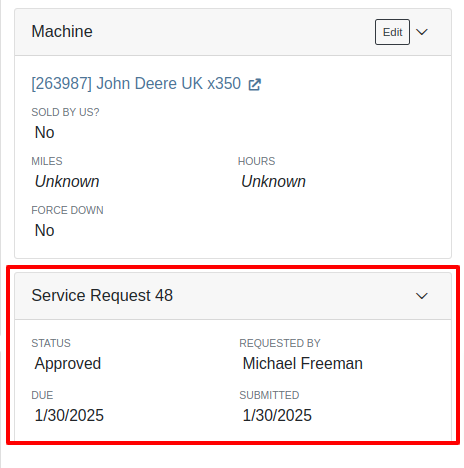 We added a widget on the Work Order Dashboard under the Machine information widget that displays information about the Service Request: