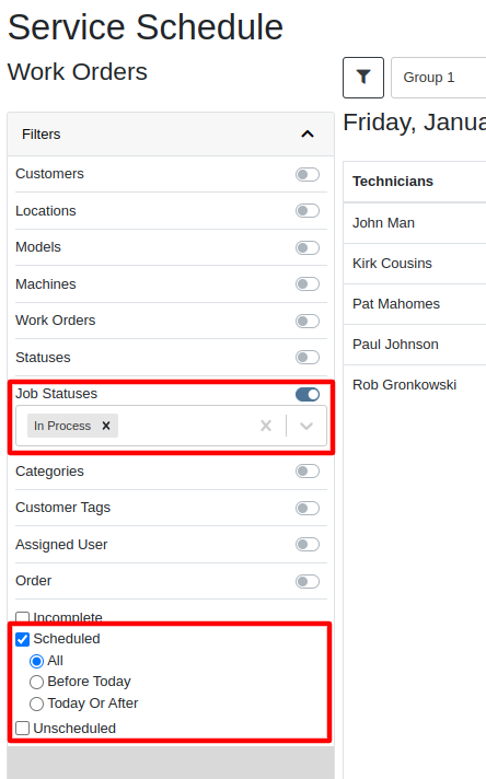 Users needed more advanced filtering options to efficiently manage Work Orders on the Service Scheduler. Previously, they could filter scheduled work orders but lacked the ability to:
