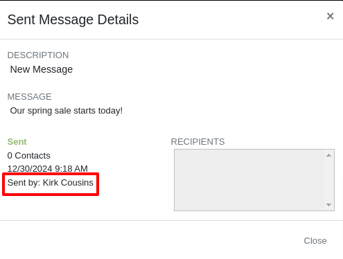 Additionally, when viewing the details of an already sent CRM Campaign Message, the user who sent it will be displayed there.