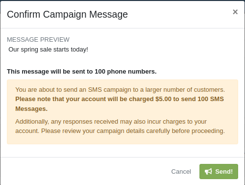 Added an additional notice when preparing to send a CRM Campaign Message. If the message will reach more than 100 phone numbers, it will display the cost that would be charged for sending the message.