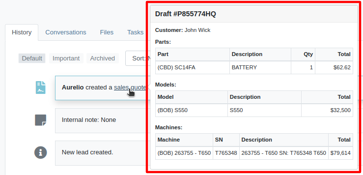Added a hover feature to the hyperlink for sales quotes on the Lead Dashboard Timeline. When users hover over a hyperlink, key details such as status, customer, parts, models, and machines are displayed, allowing for quick and clear identification of the relevant quotes.