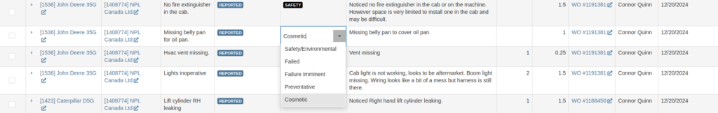 You can record a new Deficiency from a Machine’s dashboard or from a Work Order through the “Actions” menu. Once recorded, you can view them from the associated Machine’s dashboard or from the new “Machine Deficiency” data-view.