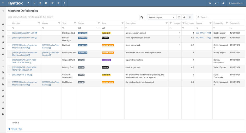 As Technicians perform repairs, frequently they find issues that have nothing to do with the work they’re currently tasked with completing. For these situations Flyntlok now has a built-in feature to record these Machine Deficiencies and to use as follow-ups with the owners.