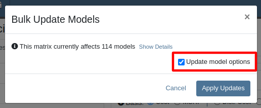 A new feature in the “Bulk Model Update” allows managers to update Model Options Pricing automatically when running a Pricing Matrix against a Model. This ensures that all associated Options are priced correctly based on the latest Matrix.