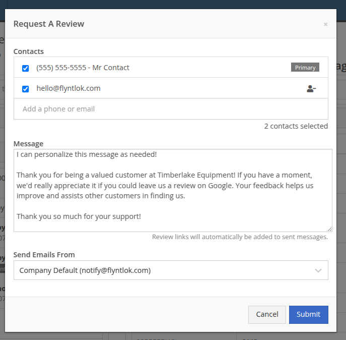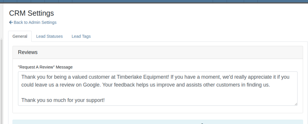 Administrators can now configure the default message by navigating to Flyntlok Settings -> CRM Settings -> General -> “Request A Review” Message,