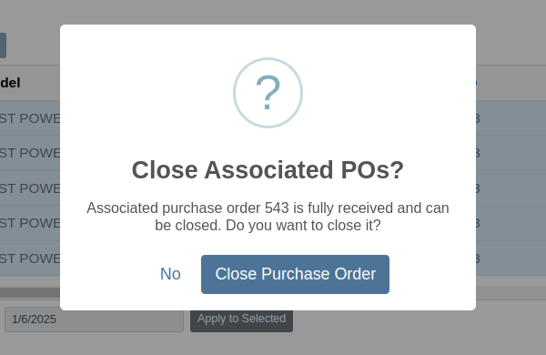 When completing a Machine Receiving Voucher that moves any of its associated POs to "Received" status, users now have the option to immediately close the PO. When applicable, this prompt will show up after clicking the Complete Voucher button: