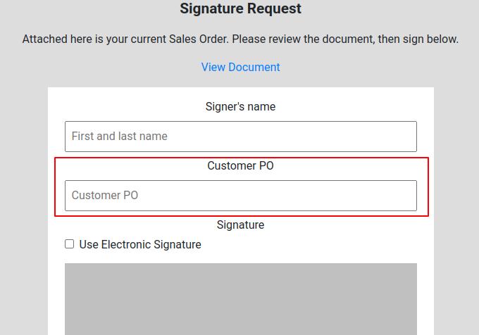 Added a Customer PO input field to the signature request page for Sales Orders. When a customer signs the document and enters a PO number, it will automatically populate the Customer PO field on the Sales Order.