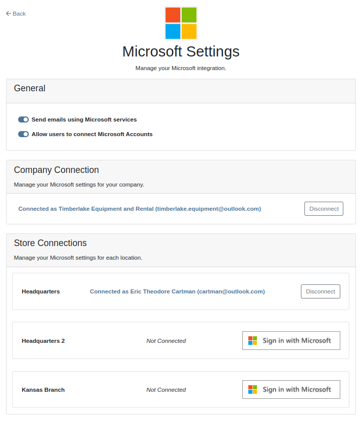 To connect Microsoft email accounts to store locations follow this steps: