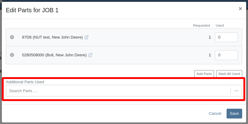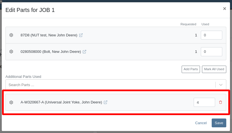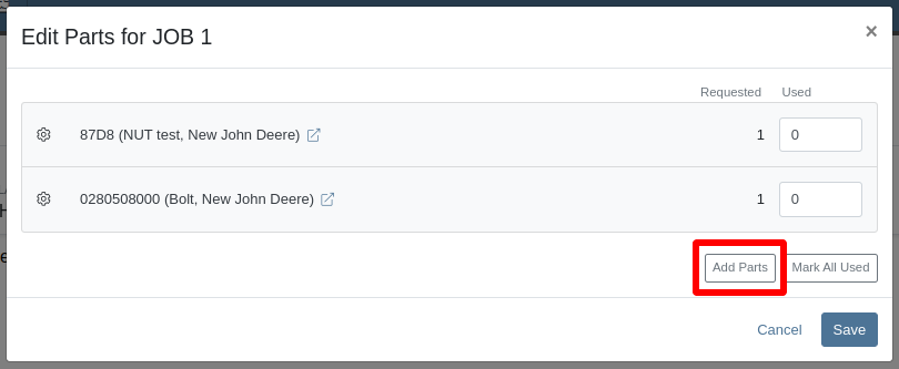 - Add Parts Button: A new button within the "Edit Parts" modal allowing users to search and add parts.
