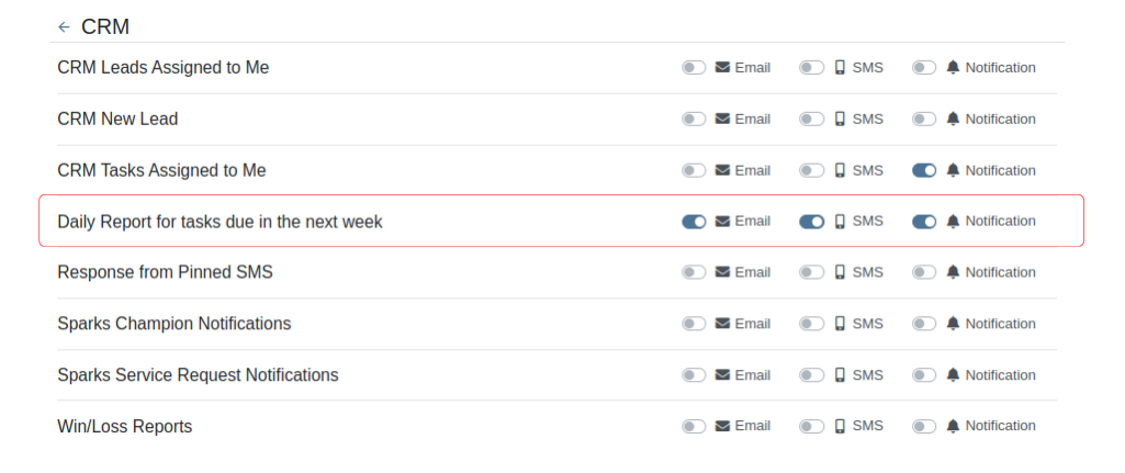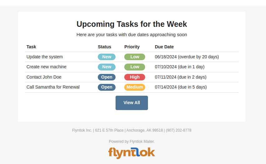 If this notification is turned on, Flyntlok will send a report about all the tasks assigned to you that are due within the next week at the end of each day. This will help users to stay up to date on their progress and avoid missing out on important tasks. Based on the selected medium (Email, SMS or notification) the notification may look slightly different.
