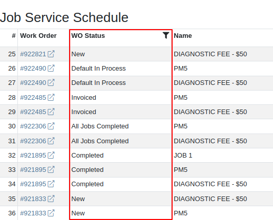 Solution: We added a new column for the Work Order status on the Job Service Scheduler. The column can be sorted and filtered as well.