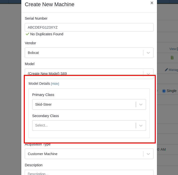 We have added Model Primary Class and Model Secondary Class fields to Machine creation on these pages: