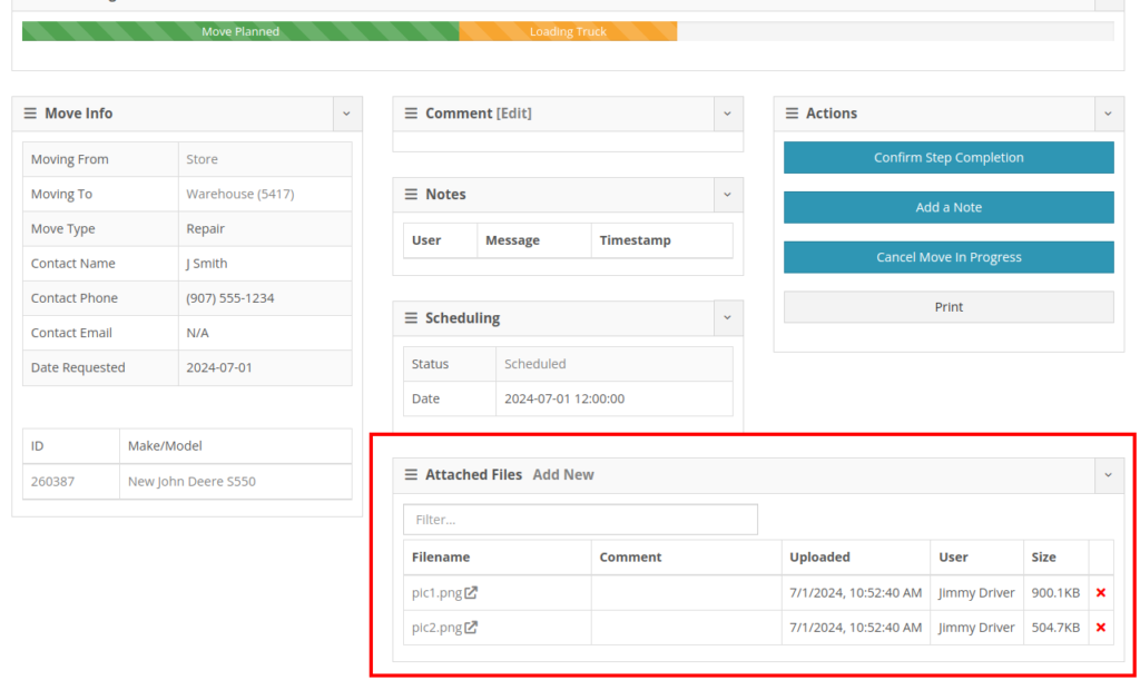 Desktop Moves Dashboard: Users can manage the files when viewing Moves on desktop. Additionally, other accepted file types (such as PDF) can be attached.