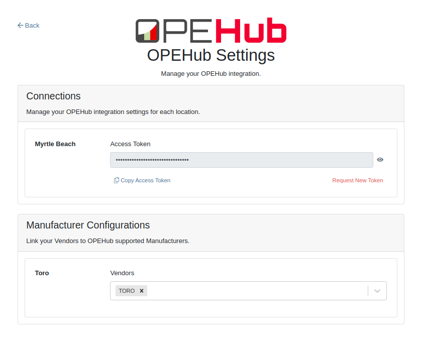 2. Choose the location you want to connect to OPEHub.3. Generate a token by clicking the "Request New Token" button. This will populate the Access Token field.4. Click on the âCopy Access Tokenâ button to copy the Access Token.5. Link your Vendors to OPEHub supported Manufacturers