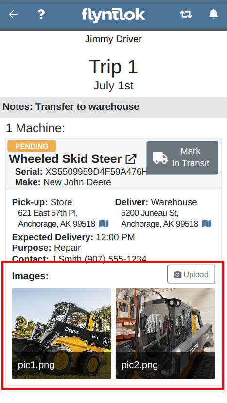 Mobile "My Trips" View: Users can now upload pictures directly from their mobile devices via the "My Trips" section. Uploaded images will be displayed in a gallery-like format, providing a visual record of machine conditions at pickup and drop-off. To upload a picture, click on the "Upload" button in the Images section: