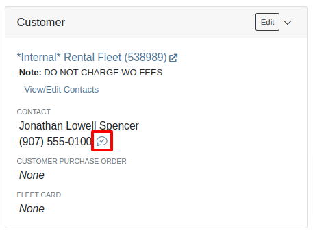New indicators have been added if a selected contact has "SMS Notify" enabled. On the Work Order Dashboard, it will show up next to the Contact's phone number with a "Text Allowed" indicator. On Sales Order pages, it will appear as a badge in the bottom right.