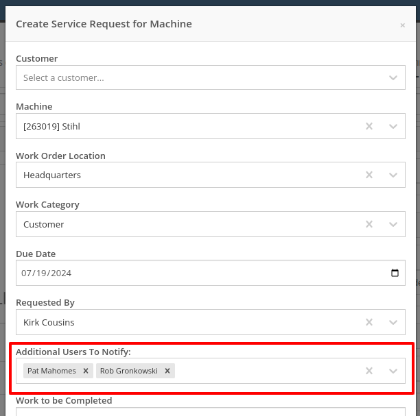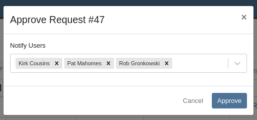 Added an “Additional Users To Notify” field to the Service Request creation form that allows you to select users to notify. Service Managers can also edit this list when approving or rejecting a Service Request.