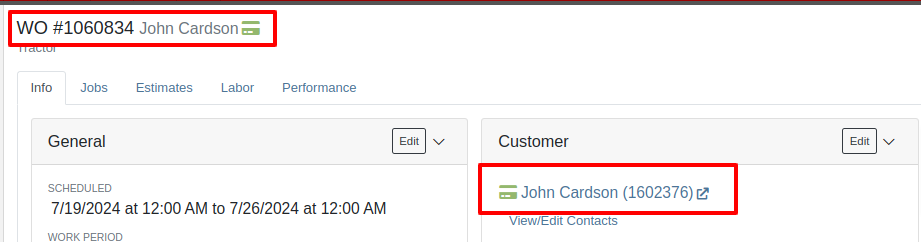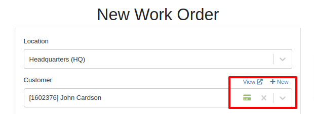 A credit card icon will appear on the New Work Order form and the Work Order Dashboard if a Customer has any cards on file.