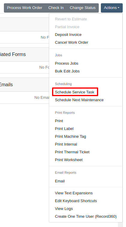 We have added an action to the Work Order “Actions” menu to create a scheduled task from the existing work order.