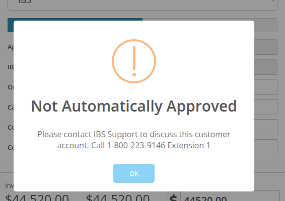 In the event an approval code is not automatically granted by IBS, you will see a pop up providing information on who to contact to follow up on the request.