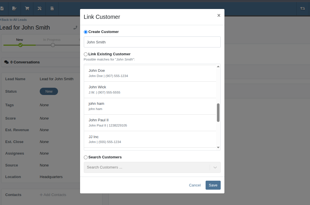 And of course, the "Search Customers" option is still available, giving you the ability to link a Lead to any of your Customers.