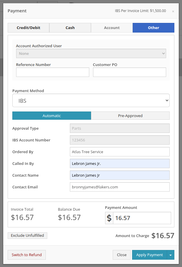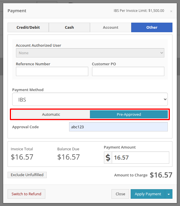 At the Point of Sale, you will see a new payment method in the “Other” section for IBS that supports two approval workflows: automatic and pre-approved. The automatic approval workflow will reach out to IBS for an approval code, and will automatically apply it to the sale if one is granted. The pre-approved workflow allows you to set an approval code that you received outside of Flyntlok on the order, then process it through Flyntlok. In both cases, the invoice will be sent to IBS for validation and processing.