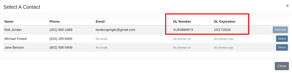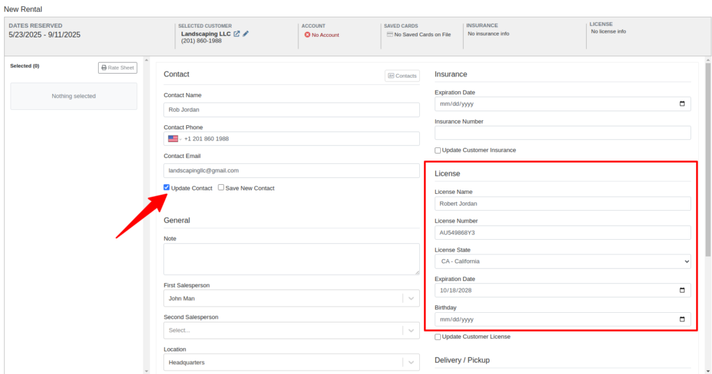 Selecting any contact with saved driver’s license info will auto-fill it in the License section of the Contract: