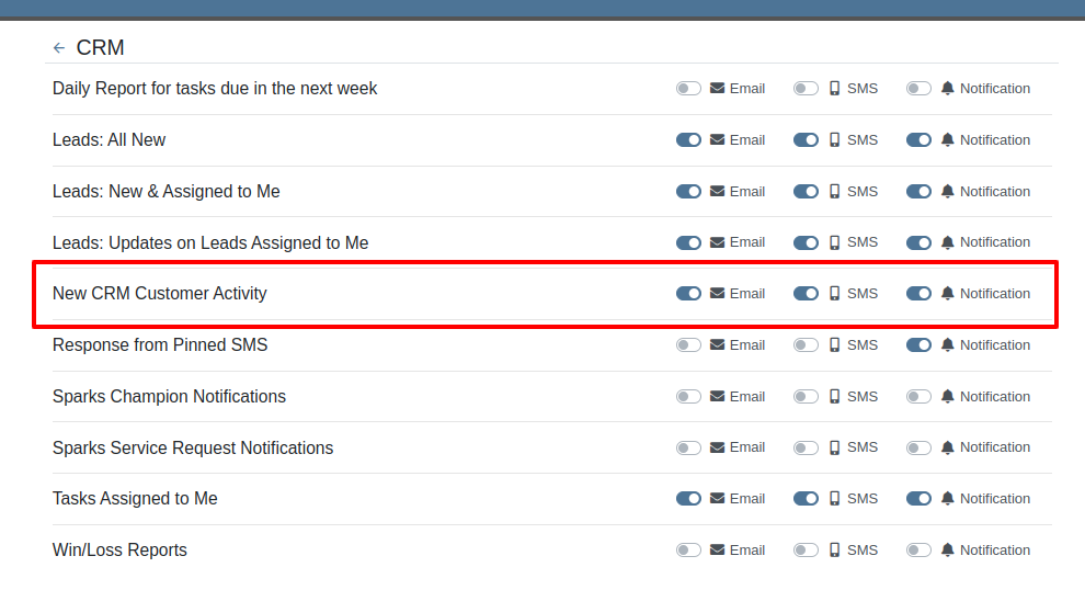 Notifications via the in-app bell icon are enabled by default. Users can also opt in to receive email and/or SMS alerts, configured in User Settings > Notifications > CRM. N.B. If the user has all of the notification options disabled, they will not receive any alert even if they were added to the Notification field on the Activity.