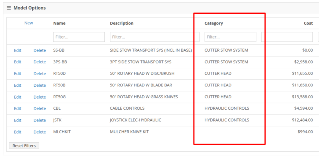 - Categories: A new "Category" field is now available, allowing you to classify and group Model Options in a more organized way. This will help you keep everything neatly structured and easy to navigate. You can add new Categories on-the-fly by editing a record and simply adding the new Category directly in that field.