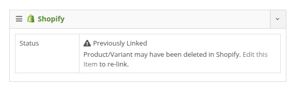 In the case of a linked item that can no longer be found in your Shopify store, the Item's connection status is displayed as "Previously Linked":
